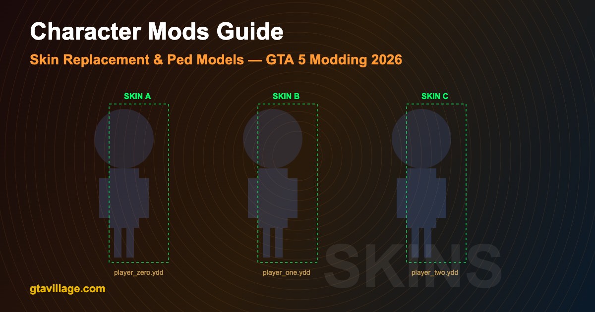 Replace default character models in GTA 5 with custom skins, celebrity lookalikes, superheroes, or entirely new ped models. This guide covers both skin replacement (replacing existing character textures) and add-on ped methods for installing character mods.