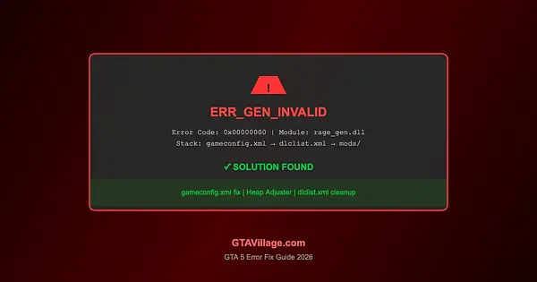The ERR_GEN_INVALID error is one of the most common crashes in modded GTA 5. This guide covers all known causes and proven solutions to get your game running stable again.