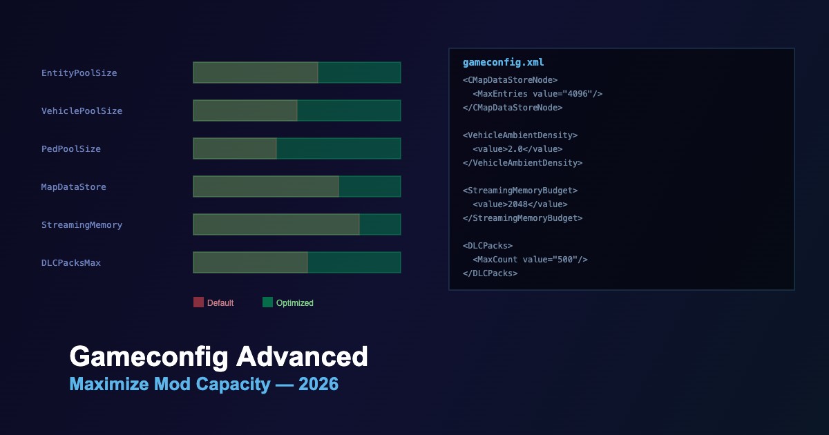 The gameconfig.xml file controls GTA 5's internal memory limits, entity pools, and resource budgets. A properly configured gameconfig is essential for running many mods simultaneously without crashes.