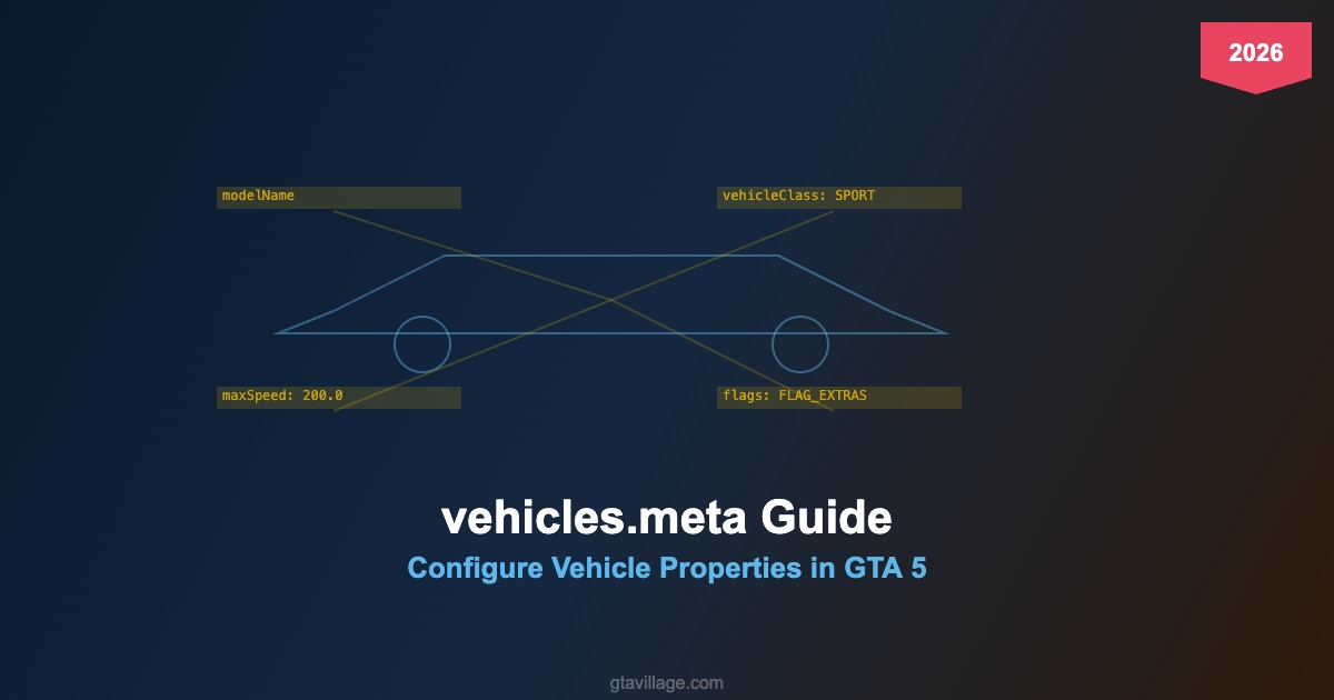 The vehicles.meta file registers every vehicle in GTA 5 with the game engine. It defines the vehicle's display name, class, type, handling reference, and various behavioral flags. Every addon vehicle mod requires a proper vehicles.meta entry to function correctly in 2026.