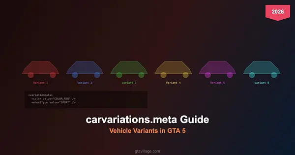 The carvariations.meta file controls how vehicles appear when spawned in GTA 5 traffic or via trainers. It defines color combinations, wheel types, livery options, and extra configurations for each vehicle model. This is essential for addon vehicle modders who want their cars to appear with correct variants in 2026.