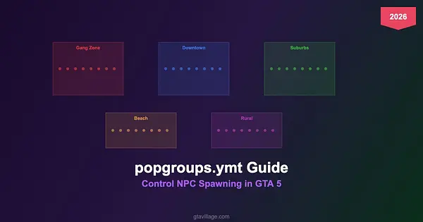 The popgroups.ymt file defines which pedestrian models spawn in each area of GTA 5. It works together with popcycle.dat (which controls density) to determine not just how many NPCs appear, but which specific models populate each zone of Los Santos.