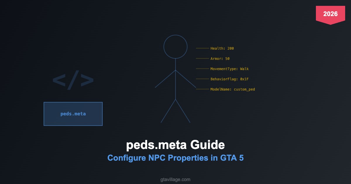 The peds.meta file is one of the most fundamental configuration files in GTA 5 modding. It defines the core properties of every pedestrian (NPC) model in the game, from basic attributes like health and armor values to complex behavioral flags and movement parameters. Whether you are adding custom character models or modifying existing NPC behavior in 2026, understanding peds.meta is essential for any serious ped modder.